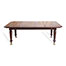 A beautifully grained dining table with a rectangular top standing on four square tapering legs terminating in brass paw feet.