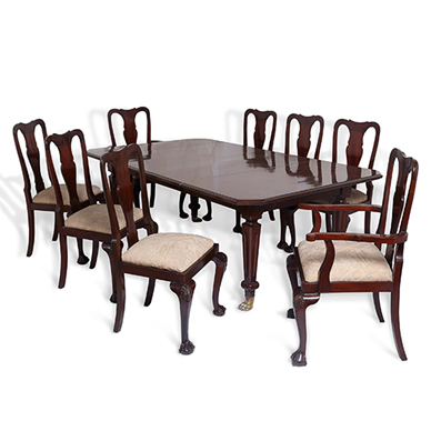 The eight dining chairs having an elegant crest rail over a solid splat back on cabriole legs with acanthus carved knees terminating in ball and claw feet