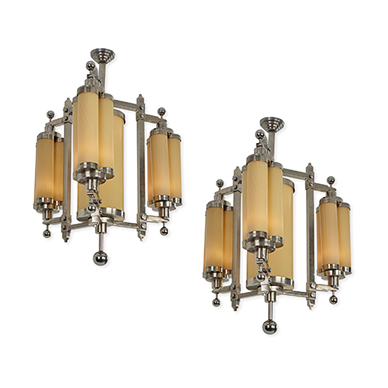 Each with chrome metal ceiling mount supporting a central main light and a square section chrome metal frame, and three elegant arms supporting nine secondary lights.
