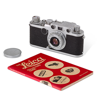 A classic Leica screw mount camera, model 2F made in 1953. It comes with a matched Leica Elmar 5cm:3.5 black scale lens. The camera comes with two instruction booklets, both from 1953. Also included in this lot is a copy of the Leica Collector's Guide, a book which features this camera.