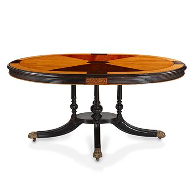Possibily late 19th century or early 20th century, the oval top is inlaid with radiating segments comprising of various timbers including rosewood and satinwood, supported atop a platform stretcher with four slender downswept legs terminating in brass paw feet on castors.