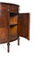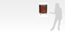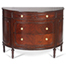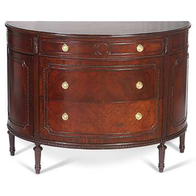 A Louis XVI-style demi-lune chest of drawers with three front drawers, flanked by a pair of cupboards each enclosing a shelf, finely carved brass hardware supported by four fluted legs