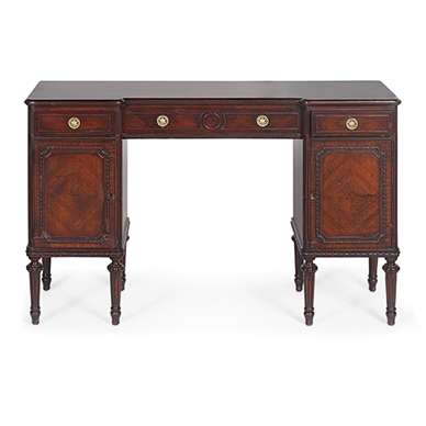 A Louis XVI-style double pedestal desk panelled on all sides, rectangular top above the twin pedestals supported by eight round tapering legs.