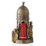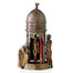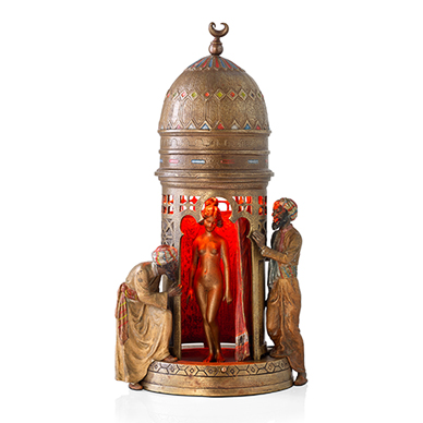 Depicting two lustful male figures, possibily Arab traders, peeping into the doorway of a structure mounted on a circular base with a cresent moon atop the domed roof. The spring operated curtain opens to reveal a lit nubile female figure possibily a slave who appears to be the object of the mens desire. Stamped 'Namgreb', (the inversion of 'Bergman'), as well as a cartouche containing the letter 'B'.