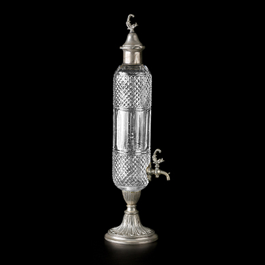 With a cut glass holding container of cylindrical form, a decorative tap, metal lid each in silver gilt resting atop a circular silver gilt base.