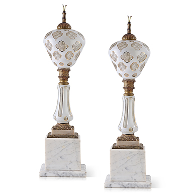 Each mounted on marble bases with over lay cut decorations