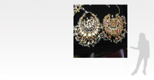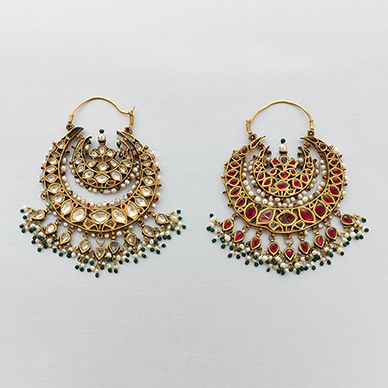 Designed as a pair of double-sided or 'do rukha' earrings with a smaller crescent inside a bigger crescent; set with ruby cabochons (foil-backed) on one side and colourless sapphires on the other side in gold, suspending a fringe of similarly designed double-sided units and seed pearls.