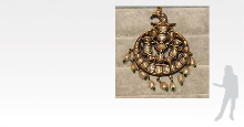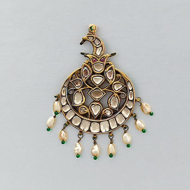 Comprising 'polki' diamonds set in a peacock motif with a crescent at the bottom, suspending a fringe of pearls and green beads. The reverse is engraved with floral motifs.