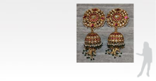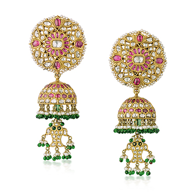 Each earring comprises an openwork flower-head design set with ruby cabochons and rose-cut diamonds, with seed pearls around the circumference. From this is suspended a similarly designed 'jhumki' terminating in fish-shaped pendants set with rose-cut diamonds and a fringe of seed pearls and emerald beads, mounted in gold.