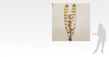 A gently graduated seven strand pearl necklace with ruby and emerald beads and seven similarly graduating central pendants set with 'polki' diamonds and ruby beads. It terminates in triangular plaques on each side, set with rose-cut diamonds and joined by a silk cord.