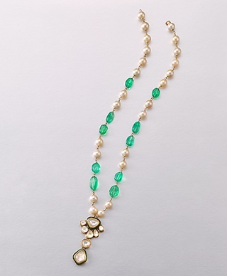 With a central pendant set with 'polki' diamonds joined to a series of tumbled emerald beads and pearls, mounted in gold.
