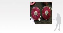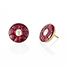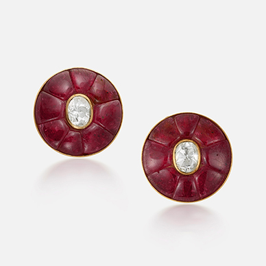 Centring on an oval-shaped rose-cut diamond with a surround of ruby cabochons, custom cut to resemble inlay work, such that there is no metal dividing the rubies.The reverse has filigree in a foliate pattern, mounted in gold.