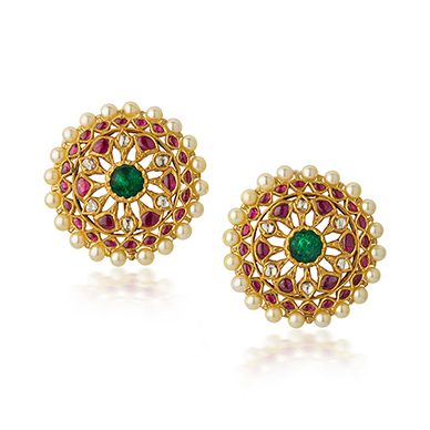Each centring on a circular emerald cabochon with ruby cabochons and rose-cut diamonds in an openwork flower-head design with a surround of pearls, mounted in gold.