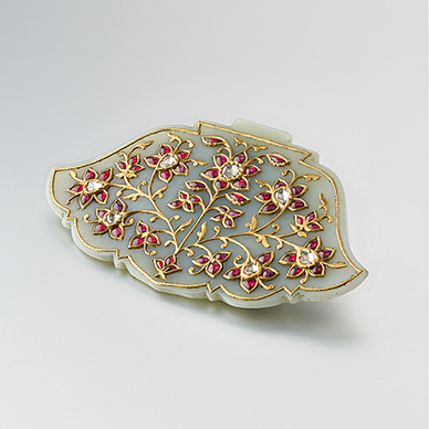A carved jade 'haldili' plaque inlaid with ruby cabochons and 'polki' diamonds in 'kundan'-work symbolising the tree-of-life motif. The plaque has a border of 'kundan'-work in gold and the reverse has intricate carvings in floral motifs.