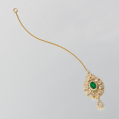 A modern interpretation of the traditional maang tika or forehead ornament centring on an oval-shaped emerald with an immediate surround of full-cut diamonds. The further surround is an openwork of gold paisleys, each set with a circular rose-cut diamond and a full-cut diamond, suspending a pear-shaped rose-cut diamond with a diamond-set surround, mounted in gold. The maang tika is attached to a gold chain on top as a hair support.
