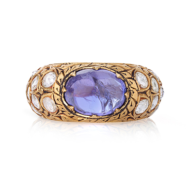 Centred on an oval-shaped tanzanite cabochon with a metal surround of engraved gold, the broad shank has clusters of rose-cut diamonds in flower-heads with engravings on gold throughout.