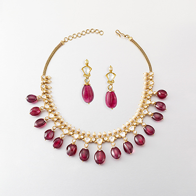 Designed as a gently graduated row of drop-shaped rubellite beads, suspended from a row of 'kundan'-set polki diamonds and pearls, joined by an adjustable silk cord. With a pair of similarly designed earrings en suite, mounted in gold.