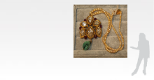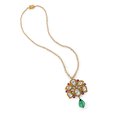 Of superior craftsmanship, the necklace is a stunning combination of 'jadau'-work, enamel and engraving techniques. A gently graduated row of pearls suspends a central openwork pendant in floral and paisley-like motifs with engraving on gold, set with rose-cut diamonds and spinel beads, further suspending a drop-shaped emerald bead. The reverse has gold enamel on an off-white ground with inlaid spinel cabochons, emerald cabochons and polki diamonds in kundan work with foliate motifs.