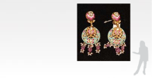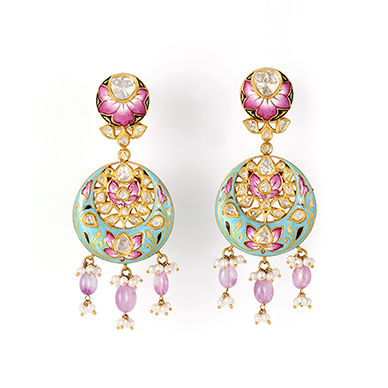 Enamelled in an unusual combination of pink and mint-blue colours with gold and black as accent colours, the earrings are centred on a 'polki' diamond surmount with an enamelled surround of pink lotus flowers on gold ground. The surmount suspends a crescent of 'polki' diamonds in 'kundan'-work and lotus flowers in pink, white and gold enamel on a mint-blue ground, further suspending three pink sapphire beads and pearls.