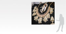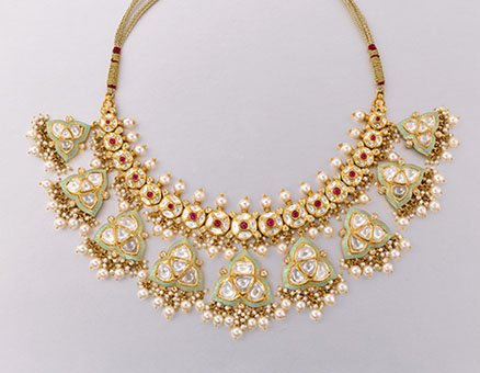 An innovative bridal necklace composed of gently graduated flower-heads set with ruby cabochons and 'polki' diamonds with a pearl lining above, suspending nine gently graduated pendants of a similar styling, set with triangular polki diamonds in 'kundan'-work and a fringe of pearls, mounted in gold. The pendants have foliate motifs in gold enamel on a mint-blue ground. The reverse features blue and gold enamel on a mint-blue ground, complementing the front of the necklace. Connected by an adjustable silk cord terminating in a pearl tassel.
