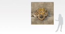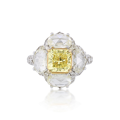 Centred on a modified square-shaped yellow diamond with a prong-style setting, the ring has a further surround of oval-shaped rose-cut diamonds with a diamond-set surround shaped like a petal, with a diamond-set outer shank.