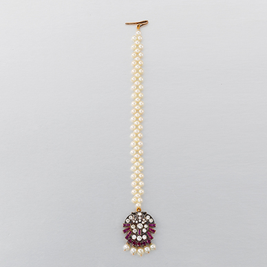 An unusual Art Deco style maang tika or forehead ornament with an openwork pendant of Art Deco style, set with full-cut diamonds and ruby baguettes, circular rubies and pearls; with a strand of interwoven pearls as a hair support.