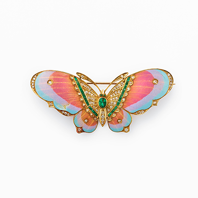 Of a butterfly design, the body is composed of an oval-shaped emerald and old-cut diamonds, and the wings have a channel of emeralds and guilloche enamel in blue, pink and gold.