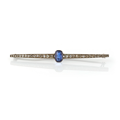 An oval-shaped sapphire flanked by single-cut diamonds on either side.