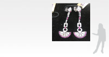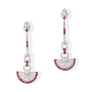 Each earring consists of a pear-shaped surmount set with full-cut diamonds and a circular ruby, suspending a series of linear geometric motifs set with full-cut diamonds and square rubies, terminating in a half-moon style openwork of full-cut diamonds with square rubies set with border, mounted in white gold.