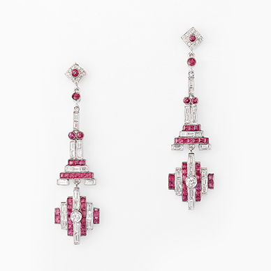 An interesting assembly of horizontal and vertical lines in a linear structure, the earrings comprise a classic surmount of a circular ruby with a diamond-set surround, suspending a series of vertical and horizontal rectangular links set with diamond baguettes, ruby baguettes and full-cut diamonds; mounted in white gold.
