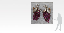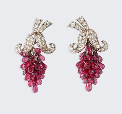 Each earring comprises bunched drop-shaped ruby beads suspended from a diamond-set surmount, reminiscent of a bunch of grapes hanging from a branch, mounted in gold.