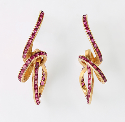 European-style earrings of free flowing curves set with ruby baguettes.