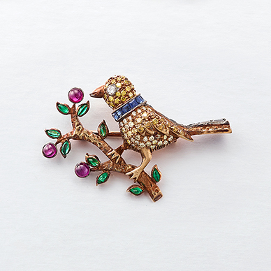 A brooch designed as a bird perched on a tree branch. The bird is composed of full-cut diamonds and circular yellow diamonds, with a channel of sapphire baguettes along the neck and length of the bird. On the branch are fruits made of circular rubies and leaves of emerald cabochons, mounted in gold.