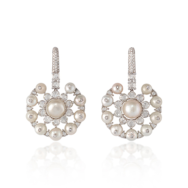 Each designed as a flower-head centred on a pearl with a two-tiered surround. The centre is surrounded by rose-cut diamonds and the second tier consists of alternating diamond-set pearls and diamonds, suspended to a diamond-set hoop. Mounted in white gold.