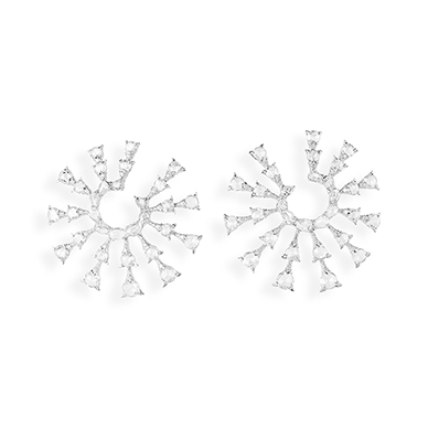 Inspired by the meadow horsetail plant, each earring has a central spiral of pear-shaped rose-cut diamonds, radiating diamond-set spokes, with each spoke consisting of two graduated circular rose-cut diamonds set in stylised prongs. Mounted in white gold.
