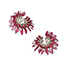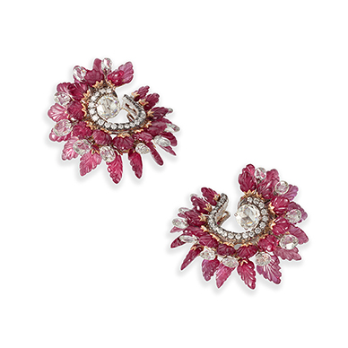 The spiral form earrings are centred on a circular rose-cut diamond with an open spiral surround, with alternating layers of carved ruby leaves and oval-shaped rose-cut diamonds set on the spiral surround.The front layer of carved ruby leaves is accentuated by a rose-gold setting of leaf motifs.