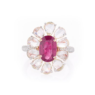 A flower-head design centring on an oval-shaped ruby on a surround of pear-shaped rose-cut diamonds, to pave-set diamonds on the band, mounted in gold.