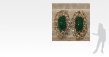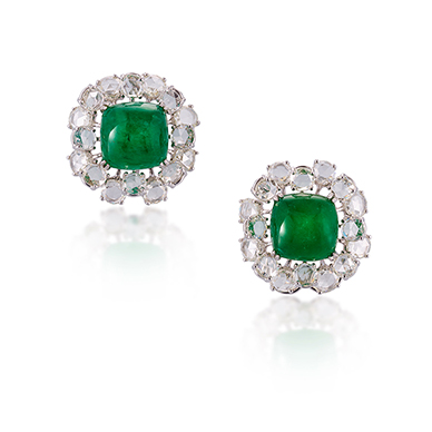 The earrings are centred on a square emerald cabochon, surrounded by two tiers of rose cut diamonds in open back setting, mounted in gold.