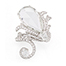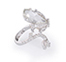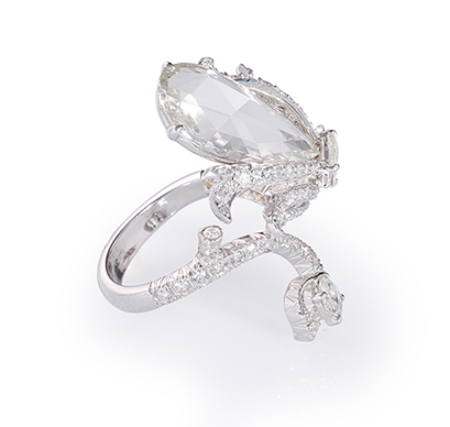 A pear-shaped rose-cut diamond in a prong-setting leads to diamond-set scrolling veins and a shield-shaped flat briolette. The ring has a slightly undulating, textured and diamond-set shank terminating with a spiral enclosing a circular rose-cut diamond in a prong-setting. The centre stone has flexibility of movement enabling the ring to be worn with either the centre stone resting on the hand or the finger, symbolising a tulip flower, mounted in white gold.