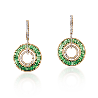Designed as a pair of hoops where the outer circle consists of calibre-cut baguette-shaped tsavorites set in a colour gradient. The inner circle is suspended within an openwork pave-set full-cut diamond frame to a diamond-set hoop, mounted in gold.