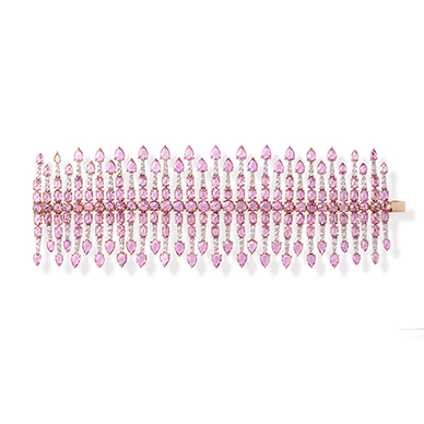 A contemporary style bracelet with a centre row consisting of round rose-cut pink sapphires with radiating spokes designed as an arrow-head design, with an alternating layer of pink sapphires and rose-cut diamonds, mounted in rose gold.