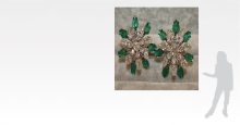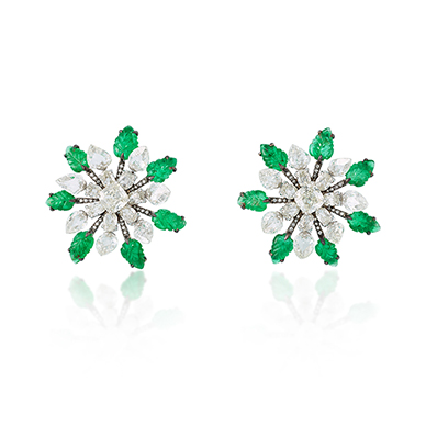 Each earring represents a magnolia flower, and is centred on an old-cut diamond with a primary surround of oval-shaped rose-cut diamonds, with each of the diamonds terminating in a pear-shaped rose-cut diamond set an a defined angle from the centre-stone. The metal spokes radiating from the centre stone terminate in carved emerald leaf.