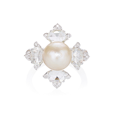 The ring is of a flower-head design centred with a pearl and surrounded with oval-shaped rose-cut diamonds, mounted in gold.