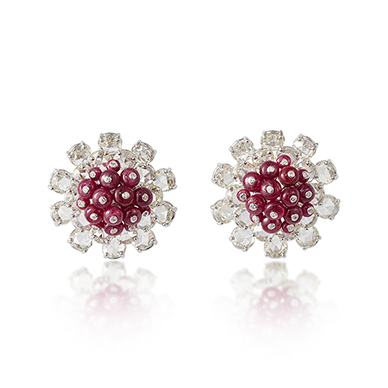 A flower-head design centred on ruby beads set with a diamond cap, with a two-tiered surround of rose-cut diamonds, mounted in gold.