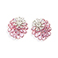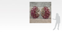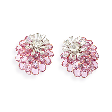 The earrings are a fusion of pink and white dahlia flowers, with the flower-head set with baguette diamonds and a central rose-cut diamond symbolising the core and the oval-shaped rose-cut pink sapphires representing the petals of the dahlia flower in bloom. The pink sapphires are set in concaving layers and fit in an angular manner on the ear lobe. Mounted in white gold.