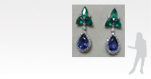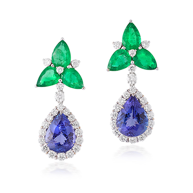 Each earring consists of a pear-shaped tanzanite with a surround of full-cut diamonds, suspended from a flower-head design of pear-shaped emeralds with diamond spacers, mounted in gold.