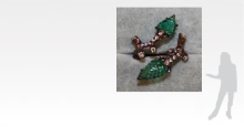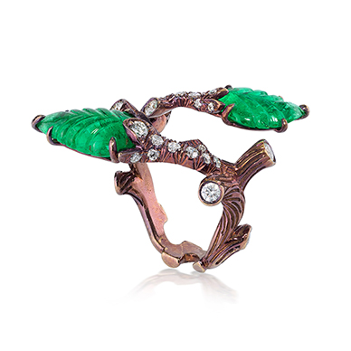 A bypass ring with identical terminals of carved emerald leaves lead to a diamond-set metal shank with brown-rhodium on gold and a textured finish.