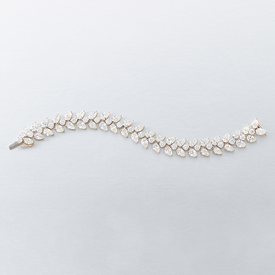 Designed as a flexible row of full-cut diamonds, bordered on each side by pear-shaped diamonds, mounted in gold.