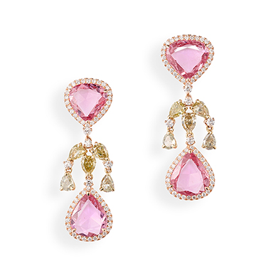 The earrings consist of pear-shaped rose-cut pink sapphires with a diamond-set surround, each connected with articulated diamond-set openwork of full-cut marquise and pear-shaped coloured diamonds, mounted in gold.