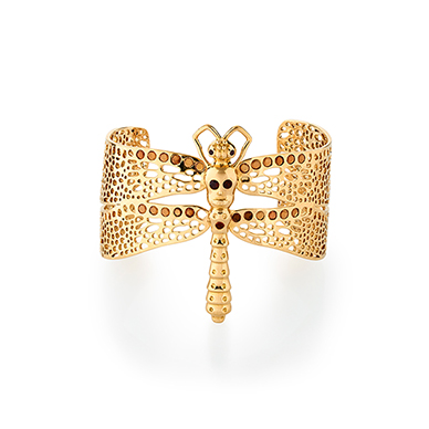 Designed as a dragonfly-shaped gold cuff, with gemset eyes, mounted in gold.